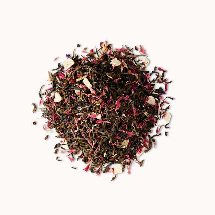 Wyrazista biała herbata China OP, uzupełniona słodyczą kandyzowanego aloesu i elegancją różowych płatków bławatka. Harmonijna kompozycja o głębokim smaku i subtelnym kwiatowym akcencie.