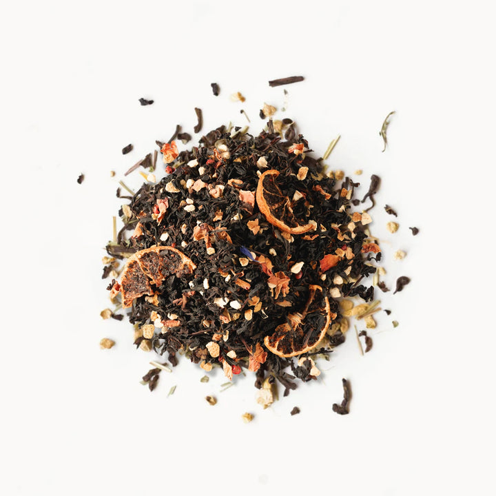 Czarna herbata jest bogata w antyoksydanty, wspiera metabolizm i naturalną odporność. Pomarańcza dostarcza witamin, działa orzeźwiająco i poprawia nastrój.
