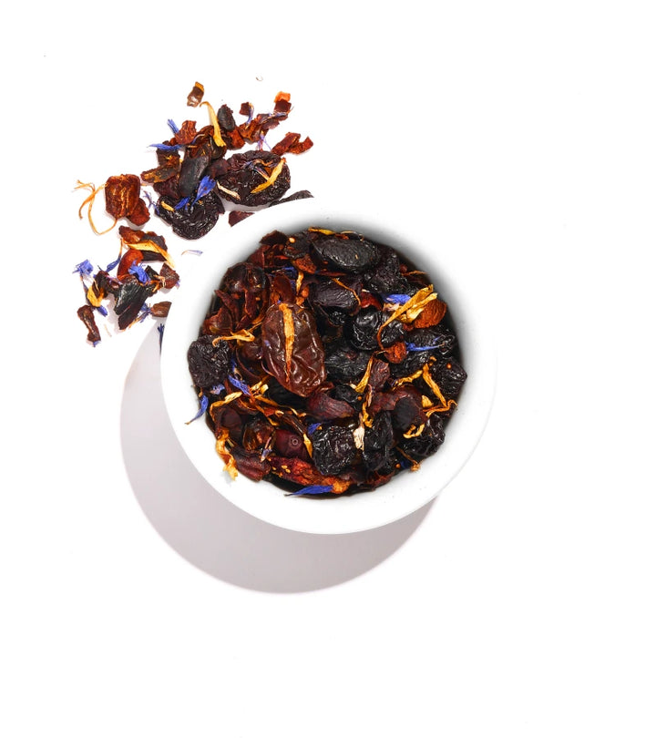 Herbata owocowa Błękitna Wiśnia jest bogata w witaminy, wspiera odporność, nawadnia i orzeźwia. Wiśnie dostarczają antyoksydantów, a hibiskus działa wzmacniająco i oczyszczająco.